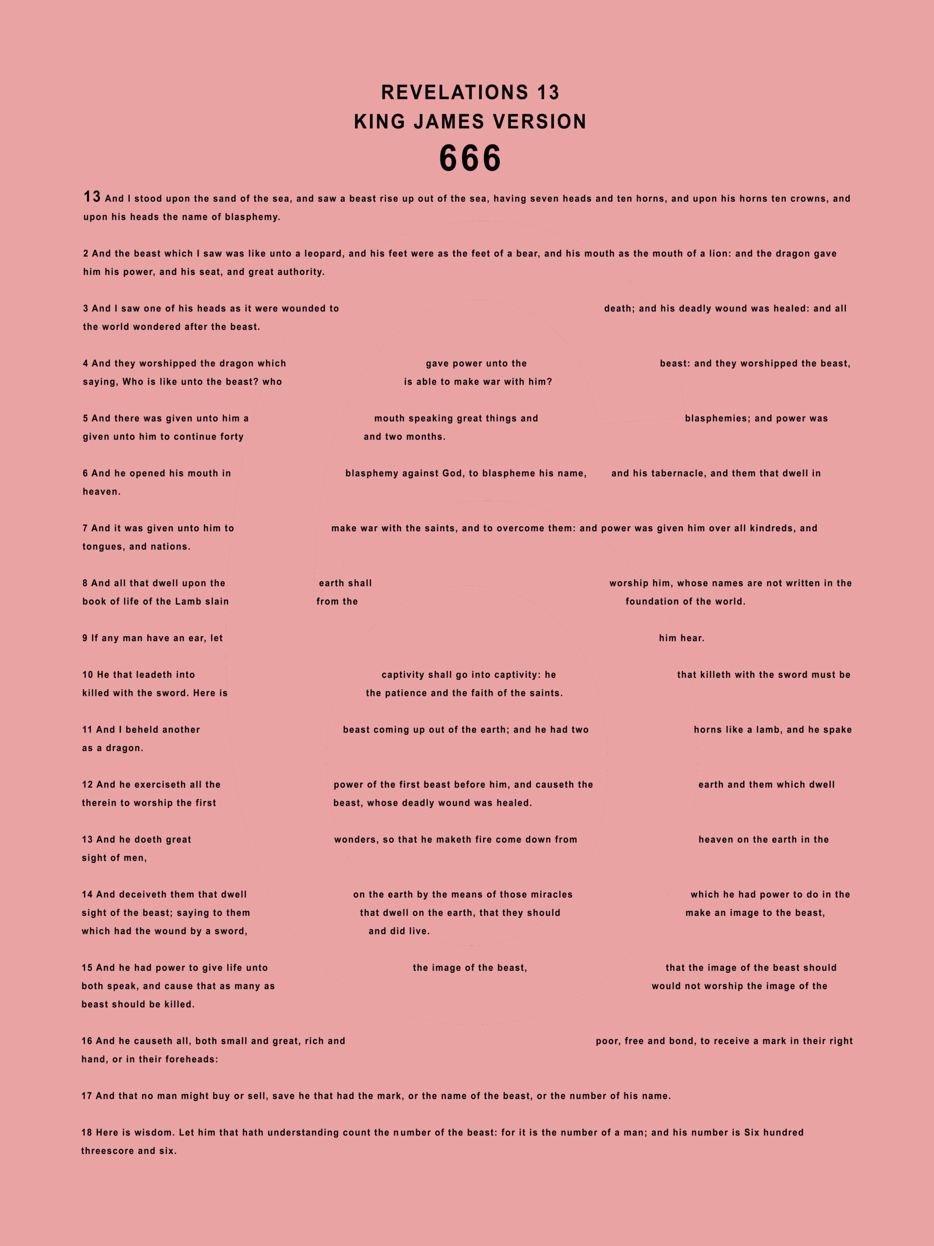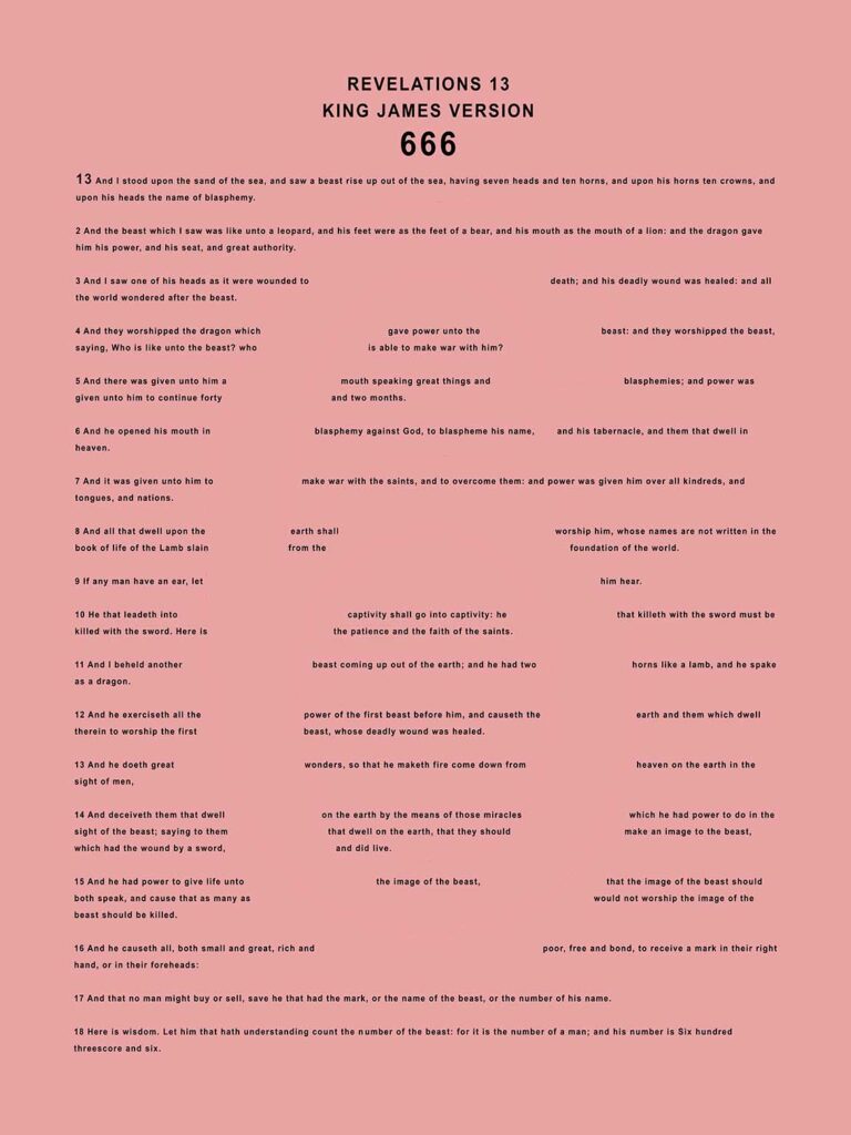 The work explores the association the number 666 has with a control system. As is almost common knowledge to the parts of the world exposed to Christianity, the number 666 appears in the Bible as the last book of the New Testament known as Revelations.