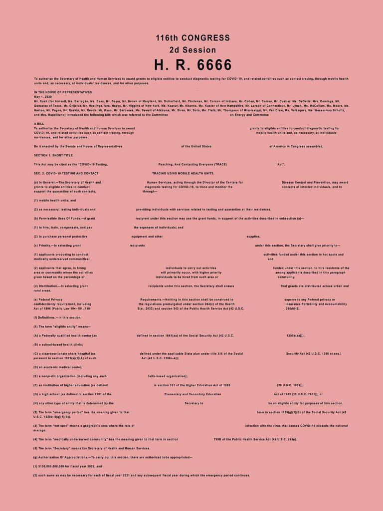 1 H.R.6666 – COVID-19 Testing, Reaching, And Contacting Everyone (TRACE) Act. Congress.gov. https://www.congress.gov/bill/116th-congress/house-bill/6666/text. Jan 05, 2020.